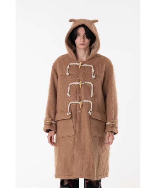 毛足の長い腰のある温かみを備えたウールシャギーを使用したダッフルコート。ロングシルエットとデビルイヤー(悪魔の耳)のフードデザインが愛らしくキャッチーなアイテム。