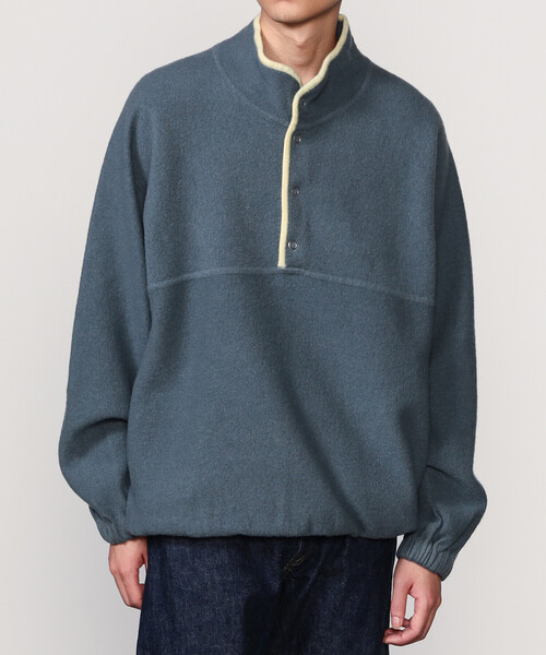 <デザイン> - スタンドネックのニットプルオーバー - スナップボタンフロント - ゴム仕様の袖口と裾 - サイドポケット×2 - ビショップ限定カラー(別注) <素材> - 縮絨加工を施したウールの織地 - 適度な厚み ※着用、お取り扱いの際は商品についておりますアテンションタグ、洗濯ネームを必ずご確認ください。 ※モデル撮影画像は、光の当たり具合やパソコンなどの閲覧環境によって、実際の色味と異なって見える場合がございます。商品の色味は商品単体で撮影した詳細画像をご参照ください。 メーカー品番:110022500 RYE TENDER | ライテンダー 衣類の生産過程で出番を失ってしまった原料にフォーカスを当て、その余ってしまった原料を「基点」に、原料が持つ魅力を最大限に引き出す形を探究し、ベーシックからトレンドまで趣味趣向にとらわれずに着回せる製品作りを目指している。