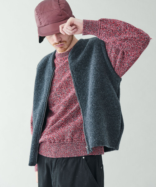 いくつもの素材を使い、織物のようなテキスタイルをニットの組織でつくる「交編」という技術によって、 新しい素材の表情や、色の可能性、着心地の良さを可能にします。世界でも希有の「交編」技術によるニットテキスタイルをスタンダードなデザインに落とし込んだ大人のリアルクローズを提案します。