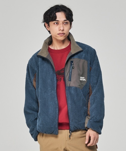 《KRIFF MAYER 秋冬アイテム「トランスフォームフリースJK」》数種類の凹凸のあるフリース生地をミックスしたフリースジャケット。メインで使用しているフリースはハニカム形状に凹凸しており、凹凸面で空気の層を生み出してくれるため、保温性が高い特徴があります。袖口部分は手の甲側のポケットを手のひら側へ折り返すことで、指貫のハンドウォーマーのように使用することができるトランスフォームデザインです。胸のファスナーポケットは、開閉する際の右腕の可動域に合わせた斜め付けを採用し、ストレスなく開閉できる設計になっています。裏地面にも左右の大きなポケットを完備しており、収納力の高さも魅力の一着。-------------------------シルエット:ややワイド生地の厚さ:やや薄手透け感:なし伸縮性:なし裏地:ありケア方法:洗濯機洗い可(ネット使用)-------------------------●KRIFF MAYER(クリフメイヤー)家族みんなの毎日に楽しさと笑顔をお届けしたい。クリフメイヤーの服にはそんな思いがたくさん詰め込まれています。メンズ・レディース・キッズ、更にドッグウェアまで展開。何気ない日々が特別な思い出に変わる瞬間を演出する、ベーシックかつオリジナリティーあふれる新しいデイリーウエアを提案します。