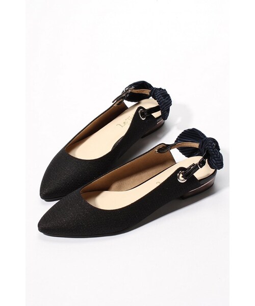 大き目のリボンが可愛いバックストラップのフラットシューズ。シンプルなパンツスタイルに合わせたり、フレアスカートなどボリュームのあるボトムに合わせても可愛い1足です。 ストラップは前に倒して履いて頂いても◎素足にはもちろん、ソックスやタイツなどレッグウエアとのコーディネートも楽しい1足。インソールにはクッションを使用し履きやすさをサポートします。