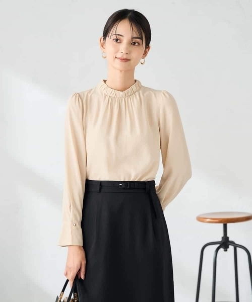 ◆さりげなく着映えも叶う上品ブラウス◆ 【デザイン】 ・プチハイネックギャザーデザインが華やかで上品な印象 ・ファスナー開きで着脱しやすく、シルエットを崩さず着ていただけます ・小さめのドビードットでさりげない表面感が着映えます ・ジャケットインでも一枚着としても使いやすいデザイン ・汎用性の高いベージュとホワイトの2色展開 【素材】 ・サラッとしたポリエステル素材 ・表面感のある素材 ・ご家庭の洗濯機で洗えます 【コーディネート】 一枚はもちろん、ジャケットやカーディガンのインナーとしても映えます。 インもアウトも決まる丈感なので、ボトムを選びません。 日常の通勤スタイルから、七五三や学校行事、発表会などお子様のハレの日にも◎ フォーマルな場やビジネスシーンに活躍してくれるベーシックなブラウスは一枚あると重宝します。 -------------------- 着用シーズン 春:◎ 夏:× 秋:◎ 冬:◎ -------------------- 透け感:ホワイトのみややあり 裏地:なし 伸縮性:なし 光沢感:なし 生地の厚さ:ふつう -------------------- ≪お気に入り登録機能の使い方≫ ■商品のお気に入り登録(ハートマークをクリック) 再入荷通知や値下げ等、お得なご案内を受けることができます。 -------------------- ※商品画像は、光の当たり具合やパソコンなどの閲覧環境により 実際の色味と異なって見える場合がございます。 商品の色味の目安は商品単体の画像をご参照ください。