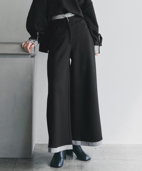 【デザインポイント】 ・ウエストと裾部分に別布がレイヤードされたようなデザインがキャッチーな ポンチ素材のパンツ ・ウエスト部分は立体感を、裾部分は重ねて縫い合わせてポイントに 【スタイリングポイント】 ・woven layered ponte topsと セットアップでご着用いただけます ・裾やウエストにシャツ地を切り替えたデザインで ラフすぎないモードな印象に ・ワイドシルエットながらも落ち感のある素材で すっきりとしたシルエットをキープ ・スニーカー合わせでカジュアルに、 ブーツ合わせでシックにも決まる万能アイテムです 透け感 なし 伸縮性 (本体)あり(別布)なし 裏地 なし ウエストゴム (後中心)あり ファスナー なし ポケット あり アジャスター なし この製品は、素材の特性により多少の染めムラやネップ、 織キズのようなものが見られる可能性がございますがご理解の上ご購入ください。 ・弱めの手洗い ・日陰の吊り干し ・タンブラー乾燥禁止 レイヤード ウーヴン ポンチ パンツ