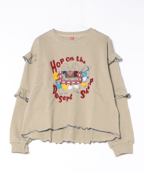 両袖に施したフリルが個性的なトレーナー。胸元のフォークロア感あふれる刺繍は、文化の交差点であるウズベキスタンのラクダをモチーフに様々な文化が入り混じった雰囲気とラグやカーペットを運ぶ様子を表現したもの。 HOP ON THE DESIERT SHIP(砂漠の船に乗って)の相良刺繍やタッセルもポイント。 バックスタイルが少し長めになったハイローヘムで、様々なボトムに合わせやすいデザイン。 カジュアルにフォークロア感を楽しめます。 ※こちらの商品は1点1点職人による手作りとなります。その為、形や色合いなど若干異なる場合がございます。あらかじめご了承ください。 Amina Collection Co.,LTD.