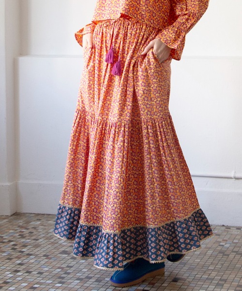 レトロポップな花柄プリントが目を惹くティアードロングスカート。しっかりとしたやわらかなコットン素材でシーズン問わず着られます。ふわっと広がるボリューミーなシルエットが魅力。裾のメタリックなテープ使いもポイントです。・ウエストゴム紐仕様 MAX~102cm・両サイドポケットあり。※こちらの商品は1点1点職人による手作りとなります。その為、形や色合いなど若干異なる場合がございます。あらかじめご了承ください。※屋外での撮影画像は、光の当たり具合で色味・カラーが違って見える場合がございます。商品のカラーは、スタジオ撮影の画像をご参照ください。Amina Collection Co.,LTD.