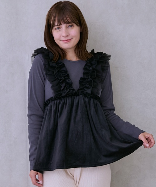 簡単にコーディネートが完成するドッキングデザインのチュニックです。フリル部分にはチュールを取り入れて、華やかな雰囲気を高めました。ネックレスやブレスレットなどでアクセントを添えるのもおすすめ。すっきりとしたパンツを合わせるとバランス良く決まります。9654217:【リンク】ドッキングフリルチュニックでキッズサイズのお子様とお揃い着用ができます。【透け感】透けない【生地の厚さ】普通【伸縮性】あり【裏地】あり【ポケット】なし【アジャスター】なし