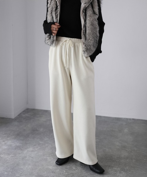 【Riberry コーデュロイ裏起毛セミワイドパンツ】\ウエストゴムでラクしておしゃれ/ おうちでもお出かけでも快適なあったかコーデュロイパンツ♪■Stylingやわらかく温もりのあるコーデュロイ素材を使用した、季節感たっぷりの裏起毛パンツが登場しました。表地にはほどよいストレッチ性を持たせた生地で、動きやすさと上品な風合いを両立。コーデュロイ特有の畝が程よい立体感を生み、シンプルながらも存在感のある一本です!裏地にはフリースタッチの裏起毛素材を使用しており、履いた瞬間からぬくもりを感じるやさしい穿き心地。真冬の外出やおうち時間にも快適に過ごせる防寒性が魅力です!スウェットやニットにスニーカーを合わせたカジュアルスタイルはもちろん、シャツやジャケットにローファーやパンプス、ショートブーツを合わせれば抜け感のあるきれいめコーデにも◎合わせ方次第でデイリーにもワンマイルウェアとしても活躍する、冬のあったか万能パンツです♪■Detailウエストは総ゴム仕様で、内側のドローコードでフィット感の調整も可能。着脱楽ちん+ストレスフリーで着用いただけます!ヒップや腿まわりにゆとりを持たせつつ、裾にかけてストンと落ちるストレートシルエット。リラックス感がありながらもすっきり見えが叶います!サイドにはポケット付きで利便性も抜群◎■Material素材はポリエステルとポリウレタン使用。ポリエステルならではの軽さとシワになりにくさに加えて、ほんのり伸縮性があるため、動きやすくデイリーにぴったりです!裏地にはふわふわの起毛加工を施しており、素肌に触れてもチクチクせず、1日中着ていたくなるような暖かさとやさしさを感じられます。▽生地感透け感:あり 〇〇〇●〇 なし(アイボリーややあり)生地の厚さ:厚い 〇〇●〇〇 薄い裏地:なし伸縮性:ややあり※この素材は性質上、発汗、摩擦等により、ほかの衣料やバッグなどに多少色落ちや色移りする場合がありますので、十分にご注意下さい。※商品の梱包には細心の注意を払っていますが、通販の特性上、到着時に畳みシワがついている可能性がございます。予めご了承ください。※お肌のデリケートな方は刺激を感じる場合がございます。※詳しいお手入れ方法は商品タグをご参照ください。【Information】◆《お気に入り登録》がオススメ◆・「商品のお気に入り登録」で再入荷通知や、ラストの通知、セール通知も受け取ることが出来ます。・「ブランドのお気に入り登録」で新商品や再入荷など、お得な情報を受け取ることが出来ます※撮影時のライティング、太陽光、ご覧になっているモニター・PC環境により、実際の商品と色味が異なって見える場合がございます。予めご了承をお願い致します。
