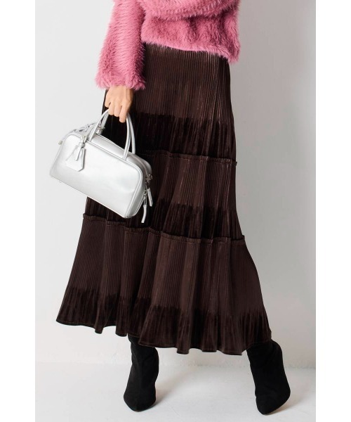 しっとりとした光沢が美しい、秋冬らしいベロア素材のギャザースカート。細やかなプリーツと、ティアードのように重ねたギャザーが繊細な立体感を演出し、女性らしい柔らかさをほんのりプラスしてくれます。ボリュームを抑えたすっきりシルエットで、甘すぎず上品に着こなせ、ウエストはゴム仕様でストレスフリーな履き心地も魅力。シンプルなニットを合わせるだけでも、素材の存在感で季節感のあるスタイリングが完成する一枚です。■素材ほどよい光沢感となめらかな肌ざわりが魅力の、カットベロア素材。軽やかでシワになりにくく、デイリー使いしやすいのも魅力です。※掲載画像は、屋内や屋外の光の加減やお客様のモニター環境などにより、実際の色味と異なって見える場合がございます。予めご了承ください。※製造工程の関係上、各採寸箇所実寸(平置き)より 【約-3cm~+3cm】程度は誤差の許容範囲とさせて頂いております。【透け感】なし【生地の厚さ】普通【伸縮性】あり