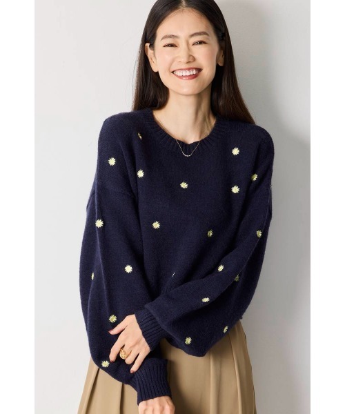 まるでアルパカニットのような、やわらかく暖かみのある肌ざわりが魅力のプルオーバーニット。ふっくらとした風合いで、秋冬のコーディネートにやさしく寄り添います。全体に散りばめられたフラワー刺繍が、さりげなくも華やかな印象をプラスし、シンプルなシルエットながら1枚でも存在感のある着こなしに仕上がります。ボトムスを選ばずデニムやスカート、ワイドパンツなどさまざまなアイテムと好相性。オン・オフ問わず、デイリーにもお出かけにも活躍してくれる1枚です。■素材アルパカのような、ふんわり柔らかな風合いで、軽やかで暖かくソフトな肌触り。チクチクしにくく、デイリーに快適な着心地です。※掲載画像は、屋内や屋外の光の加減やお客様のモニター環境などにより、実際の色味と異なって見える場合がございます。予めご了承ください。※製造工程の関係上、各採寸箇所実寸(平置き)より 【約-3cm~+3cm】程度は誤差の許容範囲とさせて頂いております。【透け感】なし【生地の厚さ】やや厚手【伸縮性】あり