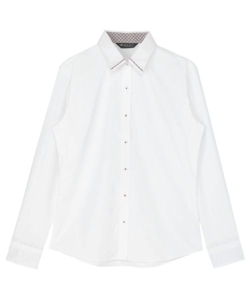 衿羽根に別生地を加え、さり気なく 彩りをプラスするマイターカラー。 人の視線を集める顔回りの 洒落感ある小粋なアクセントに。 -透け防止レディース- 透け感軽減+UVカット生地でどんな 季節もお洒落な着こなしが楽しめます。 形態安定加工と綿×ポリエステル 素材で、クリーニング要らずの 自宅で取扱い楽ちんのワイシャツ ■仕様 カフリンクス使用可能 アジャストボタン 前身頃ダーツなし・後身頃ダーツ入り 台衿内側・カフス裏側・衿羽根:別布仕様 衿:デザインあり 前立:裏前立仕様 ※別布を含む濃色生地は色落ち・移染が 発生する場合があるため、お洗濯時は 衣類の組合わせにご注意ください。 【BRICK HOUSE by Tokyo Shirts / ブリックハウス バイ トウキョウシャツ】業界トップ水準を誇るノーアイロンの形態安定加工は自宅で洗濯可能でお手入れ簡単!高度な縫製技術を用いた高付加価値シャツでありながら選ぶことを気軽に楽しめます。ベーシックから多様なデザインまで幅広いバリエーションで豊富なサイズ展開で、ディテールの隅々にまで織り込んで一枚一枚丁寧に仕立てられたシャツです。