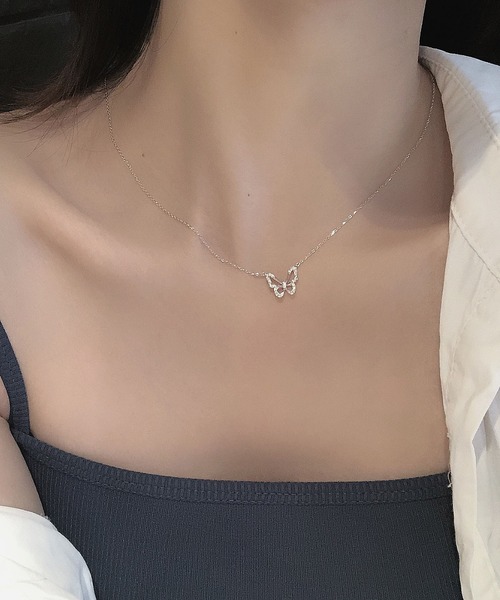 【可憐に輝くバタフライモチーフ】小ぶりながら存在感のあるバタフライモチーフが、首元でさりげなく輝くネックレス。羽のラインに沿った繊細なストーンが光を集め、上品でフェミニンな印象を与えます。動くたびにきらめきを放ち、顔まわりを華やかに彩ります。【デコルテを美しく魅せる華奢デザイン】華奢なチェーンが女性らしい印象を引き立て、デコルテを上品に演出。Tシャツやブラウス、ニットなどどんなコーデにも馴染みやすく、デイリーにも特別な日にも使える万能アイテムです。シンプルながらトレンド感のあるデザインが魅力。【ギフトにもおすすめのアクセサリー】シルバーの上品な輝きが肌になじみやすく、季節を問わず活躍。大切な方へのプレゼントにもぴったりです。カジュアルにもドレスアップにも合わせやすく、永く愛用できるネックレスです。※店頭及び屋外での撮影画像は、光の当たり具合で色味が違って見える場合があります。またご覧いただきますモニターや使用環境により実際の商品と多少色味が異なって表示される場合がございます。予めご了承をお願いいたします。★商品のお気に入り登録→【カートに入れる】右側の♡をクリック★ブランドのお気に入り登録→ブランドタグのページからお気に入りをクリック※ご注文いただいた予約商品のお届け時期の確認は、注文履歴ページより行えます。※セールは予告なく終了させていただく場合がございます。