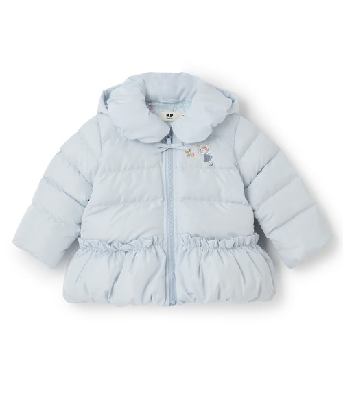大きな衿とボリュームを持たせた裾周りが可愛らしいコートです。中わたには、デュポン社のSoronaを使用、軽く、保温性に優れています。フードは、シーンやコーディネートに合わせて、取り外し可能。左胸にはmimiちゃんのワンポイント入り、前開きの引手にはリボンが付いています。これからの寒い季節、デイリーに活躍する1枚です。