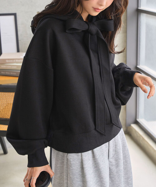 どこか上品に着れる大人可愛いフーディートップス。スウェットライクなカジュアルさに首元のビッグリボンが女性らしいデザイン性のあるアクセント。お顔周りを華やかに、且つ華奢見えを叶えてくれるプルオーバートップスです。【素材・サイズ感】膨らみのあるするんとした滑らかさが心地いいダイバー素材。ゆったりとしたオーバーサイズに程よく短丈で仕上げたバランスの良いメリハリがポイント。立体感を生み出すシルエットが抜け感を演出し着るだけで雰囲気のあるスタイリングに仕上げてくれます◎【STAFFコメント】ビッグリボンが大人可愛い長袖スウェットトップス。1枚で華やかに着映えするパーカーです。ボリュームスリーブもお洒落なアクセントに◎カジュアルになりがちなスエットもこちらはフェミニンな着こなしが叶います。ガーリーなデザインがインパクトのあるカジュアルカットソーです。《KOBE LETTUCE ー神戸レタスー》 プチプラレディースファッションからコスメまで、トレンドアイテムを豊富に取り揃えております。 毎シーズン発売されるインフルエンサーとのコラボ商品はSNSでも話題に。