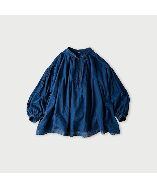 ムラや綿の欠片の飛び込みがあっても美しいと思えるインドカディの生地はインドの村々の家庭で大切に紡がれ、織られています。温かみのある素朴な生地のふくらみは現代の機械で出せない大好きな風合い。細い手紡ぎ糸は糸切れもしばしば。ころんとした節がたま~にあるのは途中で糸が切れて結び直したものです。全てが整った表情ではありませんが、出来るだけきれいに繕って仕上げています。おろしたての藍も色褪せた藍もいつの藍も美しいと思えるのは手仕事のあたたかみが溢れているから。細いタックとレースを眺めているだけで可憐なディティールにうっとりしてしまうほど美しいブラウスです。