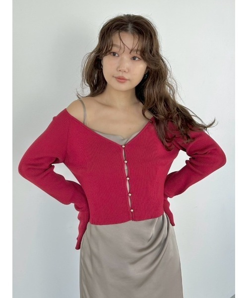 【さりげないデザインがサマになる、シンプル上品な短丈カーデ】【Design/Styling】シンプルなクロップド丈のリブカーディガンは、着回しやすさをキープしつつ素敵に映えるディテールにこだわった一着。デコルテが美しく映える天幅広めのネックラインや、袖口のフレアデザインがどこかモードな印象。フロントに並んだ半球体のゴールドボタンも洒落たアクセントを加えます。モダンな印象をさらに高めるのは、なめらかで品が香る表面感。とろみがあるレーヨンと丈夫で扱いやすいコットンをMIXし、気持ちいい肌触りや、吸湿性・通気性に優れた糸にしました。細いリブに編み上げることで程よいフィット感が生まれ、ボディラインもきれいに見せてくれます。今シーズンは、特にワンピース合わせがおすすめ。ラフに羽織っても、ボタンを留めてプルオーバー風に着てもおしゃれにまとまります。カラー展開は、4色。ベーシックに使えるWHT、差し色として活躍するRED、シックで上品なBRW、モードなBLKがラインナップ。※照明の関係により、実際よりも色味が違って見える場合があります。予めご了承ください。またパソコン・スマートフォンなどの環境により、若干製品と画像のカラーが異なる場合もございます。予めご了承ください。商品の色味は、商品単品画像をご参照下さい。※商品画像はサンプルのため、色味やサイズ等の仕様に変更がある場合がございますので、予めご了承ください。