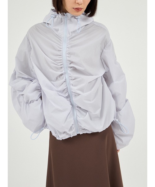 ■撥水加工 透け感:ややあり 裏地:なし 伸縮性:ややあり 生地の厚さ:やや薄手 ポケット:あり ■Design セミシアーのスポーティーな素材にemmiらしいギャザーディテールを身頃、袖にたっぷりとデザインしました。 軽く、畳んでもシワになりにくくアウトドアシーンにもトラベルにも長いシーズンで活躍するブルゾン。 バランスの取れやすい着丈でスタイルアップして見えるのも嬉しいポイント。 ※照明の関係により、実際よりも色味が違って見える場合があります。 またパソコン・スマートフォンなどの環境により、若干製品と画像のカラーが異なる場合もございます。予めご了承ください。 商品の色味は、商品単品画像をご参照下さい。 ※商品画像はサンプルのため、色味やサイズ等の仕様に変更がある場合がございますので、予めご了承ください。