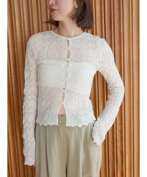 透け感:あり伸縮性:あり生地の厚さ:薄手■Designシャーリング風の編地がポイントのニットプルオーバー。前後2wayで着用可能。コンパクトなサイズ感に設定しており、インナーとしても活躍間違いなし。※照明の関係により、実際よりも色味が違って見える場合があります。またパソコン・スマートフォンなどの環境により、若干製品と画像のカラーが異なる場合もございます。予めご了承ください。商品の色味は、商品単品画像をご参照下さい。 ※商品画像はサンプルのため、色味やサイズ等の仕様に変更がある場合がございますので、予めご了承ください。