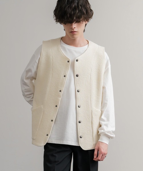 Upscape Audience アップスケープオーディエンス 日本製 国産 尾州 コットンキルト ストライプ柄/ケーブル柄/クロス柄ノーカラースナップベスト AUD7331