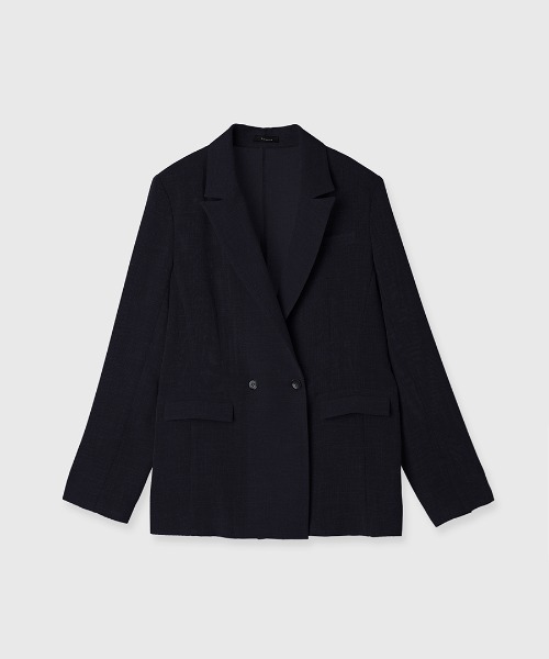 クラシックと通気性を両立する一着 ツイード風の表情をもたせたドライタッチなメッシュ素材を採用し、見た目にはきちんと感を保ちつつ、実用性としての通気性・軽さにこだわったダブルジャケット。暑い季節でも羽織りやすく、さらりとした着心地が魅力です。構築的なシルエットを実現するために薄手の肩パッドを配し、マニッシュな印象を出しながらも、素材の軽やかさでどこか女性らしさを残すバランスを意識しました。フロントの水牛調ボタンが、自然な抜け感とほんのりとしたラグジュアリー感を添え、ディテールで品を引き上げています。Tシャツやタンクトップにさらっと羽織るだけで、カジュアルなスタイルもきちんと感をプラス。暑い季節の“きちんと見せたい”スタイルにも対応できる、使い勝手のよい一着です。コーディネート“ゆる×きちんと”のミックス リラックスしたTシャツ × ハイウエストデニムなどに羽織れば、大人のこなれ感を演出。“オフィス寄り”な組み合わせにも きれいめのブラウス × スラックス × ヒールで、暑い時期のクールビズ風スタイルにも対応。アクセント使い 明るめカラーのインナーや小物を差し込むと、単調になりがちなコーデに表情をもたらします。