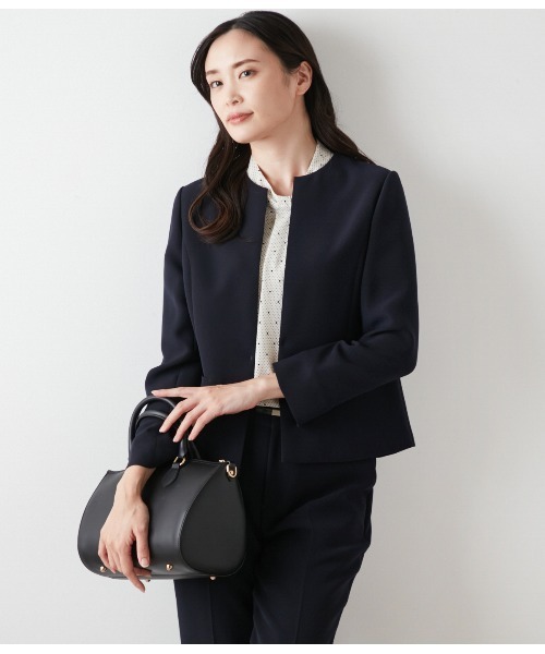 組み合わせ自在な好印象セットアップライトな着用感が嬉しい、セットアップ対応のノーカラージャケット。普段使いに最適な扱いやすい素材で、通勤やオケージョンシーンはもちろん、出張などにも活躍するアイテムです。同素材でテーラードジャケット(品番:51015111)、ブラウス(品番:51615111)、スカート(品番:51215111)、パンツ(品番:51315111)(品番:51325111)も展開しており、お好みの組み合わせでお楽しみいただけます。カラーはナチュラルなアイボリー、スタイリングを引き締めるネイビーの2色展開。■素材ナチュラルなストレッチ性と反発感のあるポリエステル糸を使用したダブルクロス。軽量かつしわになりにくく、ご自宅で手洗いも可能な扱いやすさが魅力です。■デザイン1ホック留めのノーカラージャケット。ペプラム切り替えでウエストをすっきりとさせ、切り替え位置に沿ってポケットを付けることで実用性も高めました。スリット開きの袖口は、折り返して軽さを出すのもおすすめです。裏地なし。■シーズン2025年春夏商品