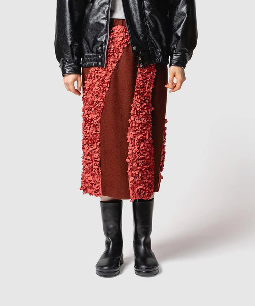 同系色の異素材を組み合わせた、奥行きのある表情が魅力のスカートー デザインについて・ニット地と花びら状のパーツを流れるような切り替えで配置し、動きのあるシルエットに・色味を揃えつつ、素材で変化をつけることで、上品さと存在感を両立・ウエストはゴム仕様で、見た目以上にストレスフリーな着心地ー スタイリングについて同素材や同系色のトップスと合わせることで、統一感のあるスタイリングに仕上がります。足元は薄めのフラットシューズを合わせると上品さのなかにリラックスさを感じる洗練されたスタイリになります。■素材表地:毛65%、ナイロン35%別布:ポリエステル100%裏地:ポリエステル100%■素材の特徴・圧縮による独特なニットの風合い・3Dの花びらをチュール素材に密に刺繍し、重厚でありながら軽やかな雰囲気に仕上げている■素材の質感透け感:なし裏 地:あり伸縮性:ややあり光沢感:なし生地の厚さ:厚いポケット:あり【muller of yoshiokubo】Dress For Daily Life 〜ドレスを着るという楽しみを日常に〜「muller」は、スペイン・アラゴン州でつかわれる方言で“女”を意味する言葉。この言葉を冠することで、ローカルでマイナーなものが常に新しさと驚きを運んできてくれる、という確信をブランド名に込めています。「女性が着る洋服とは?」を追求した先に見出したのが、女性だけのファッションであるドレス。これをブランドの象徴に、「いつの時代でも、どんなに時間が経っても、身につけることで喜びや心躍る気持ちになれる一着を」と、ドレスだけでなく、トップスやスカート、パンツという形で提案しています。【お買い物をよりお楽しみいただく為に】▼商品のお気に入り登録(♡マークをクリック)完売カラーの再入荷や、ラスト1点の通知を受ける事ができます。▼ブランドのお気に入り登録新商品や再入荷など、いち早くブランドのお得な情報を受け取ることができます。
