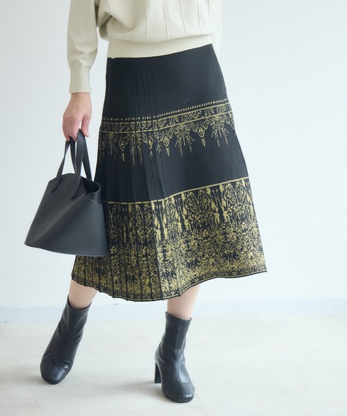 動きと輝きで魅せる、華やぎスカート<POINT>上品なラメのきらめき。美シルエットを叶えるフレアライン。ご自宅で手洗い可能なイージーケア。【デザイン・シルエット】きらめくラメ糸を編み込んだニット素材は、動くたびに光を受けて表情を変える、目を惹く一枚。程よい広がりのフレアシルエットが、身体のラインを拾いすぎず、動きにニュアンスをプラス。両サイドにはプリーツ調の編地デザインをあしらい、視覚的に縦のラインを強調してスタイルアップも叶えます。ウエストはゴム仕様で、リラックス感のある穿き心地。【素材感】ポリエステルをメインにした軽やかなニットは、厚すぎず程よいハリ感が特徴。春から秋、肌寒い初冬まで、ロングシーズン活躍する万能スカート。【カラー】シルバー ゴールド 2色展開【スタイリング】タートルネックと合わせて、上品にきらめく冬のワントーンコーデに。シャツ+ショートブーツで、きちんと感のあるオフィスコーデにも。裏地:なし光沢:あり伸縮性:あり透け感:なし生地の厚さ:普通ポケット:なし※照明の都合上、多少の色ブレが生じてしまう可能性がございますので、予めご了承くださいますようお願い致します。---------------------------------------------------●お気に入り登録でお得情報を手に入れよう!「商品のお気に入り登録」をすると、再入荷通知や、ラスト1点の通知、セールの通知など、お得情報が届きます。また、マイページでいつでも確認が可能になります。「ブランドのお気に入り登録」をすると、新商品や再入荷、などいち早くブランドの最新情報をお届けします。ぜひ、ご利用ください。----------------------------------------------------