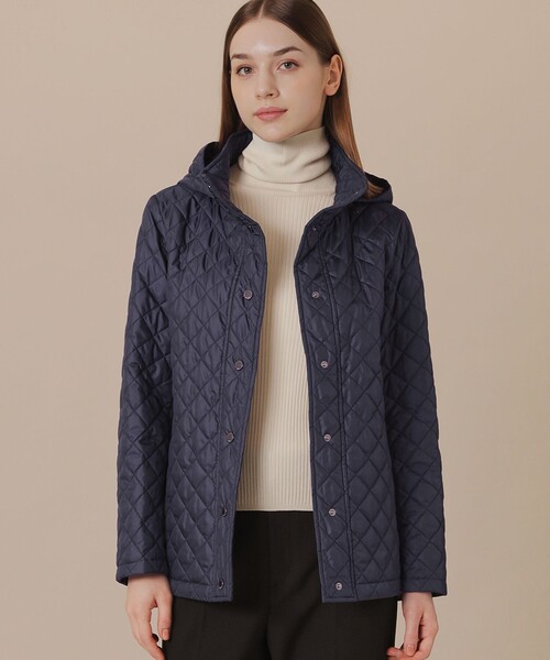 【着用推奨シーズン:春・秋・冬】 <素材説明> 表側にポリエステルのマイクロファイバーを使用したタフタ素材、裏側には滑りの良い高密度ポリエステルタフタを使用した中わたキルトです。 <デザインポイント> 取り外し可能なフード付きで、フードを外せばエレガントにも着用出来るコーディネートの汎用性の高い中わたキルトコートです。シルエットはストレートで脇の切り替えで横張りを抑えています。程よい光沢のあるタフタ素材がキレイめカジュアルな印象です。裏地なしです。同素材のフーデットコート(品番:G5A72686)もご用意しております。
