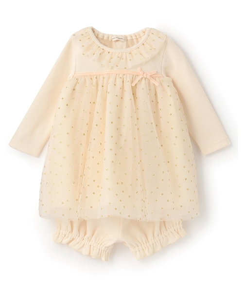華やかに広がるドット柄のチュールが魅力的なベビースーツです。裾を絞ったパンツのシルエットが愛らしいポイント。トップスの後ろ衿ぐりは、お着替えしやすいゴム仕様です。それぞれ単品使いできるため、お手持ちのお洋服とも合わせられます。【おすすめの着用時期は秋冬シーズン】【透け感】透けない【生地の厚さ】普通【伸縮性】あり【裏地】なし【ポケット】なし【アジャスター】なし