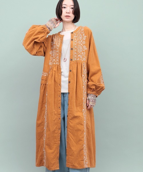 華やぎ刺繍で、着るだけで気分が上がるコーデュロイワンピース■デザイン華やかな刺繍とキラリと光るスパンコールが目を惹くRicoのロングワンピース。前あきボタン仕様だから、ワンピースとして1枚で着るのはもちろん、軽やかな羽織としても活躍します。愛らしいお花やペイズリー柄に、タック入りでふんわり広がるシルエットが女性らしさを演出。さりげなく体型カバーもできるので、安心してデイリーに取り入れられます。ブーツやデニムと合わせて、季節ごとのコーディネートも楽しめる、華やぎと着心地を両立した一枚です。■サイズ感レディースフリーサイズゆったりとした身幅でリラックスして着られるサイズ感。■素材感細い畝の柔らかなコーデュロイ素材がシーズンムードを高めてくれます。■スタイリングスキニーデニムやフレアパンツと重ね足元はショートブーツで、カジュアルながら刺繍で華やかに。ハイネックTシャツにサッと羽織るだけで、こなれ感のあるコーデが完成します。■カラーブラック/グリーン/マスタード■お手入れ手洗い/ドライクリーニング---------------------------------透け感:透けない伸縮性:なし裏地 :なし光沢 :なし生地の厚さ:普通ポケット:あり---------------------------------【 Rico / リコ 】こだわりの詰まったプレミアムコレクション。" Rico "とはスペイン語で「豪華、豊か、おいしい」などの意味があり、英語の Rich のような意味があります。伝統技術や刺繍などを贅沢に施した、一味違ったプレミアムな商品をお楽しみいただけます。【お取扱い上のご注意】スパンコール部分には鋭角、鋭利な部分があることがあります。 肌や他の物に引っ掛かりを感じる事があります。 ケガをしないように充分ご注意ください。 スパンコール部分は強く押したり、曲げたり、ぶつけたり、摩擦など無理な力が加わることで破損する恐れがありますのでご注意ください。小さなお子様の手の届かない所に保管してください。・濃色の場合、摩擦や水濡れによって色移りする場合がありますので単独で洗って下さい。また、淡色の衣類との併用はご注意下さい。・濡れた状態で放置したり、他の物と重ねたりしないで下さい。・お洗濯やクリーニングによって、多少縮んだり色落ちしたりする場合があります。・お洗濯の際には、洗濯ネットを使用して下さい。・デリケートな素材の為、極度な力が加わりますと滑脱する恐れがありますのでご注意下さい。・アイロンの際には、当て布を使用して下さい。・直射日光や蛍光灯の長時間照射は、変色の要因になりますのでご注意下さい。【TITICACAのお買いものをお楽しみいただくために!】▼商品のお気に入り登録完売カラーの再入荷通知や、ラスト1点の通知、セールの通知も受け取ることができます。▼ブランドのお気に入り登録新商品や再入荷など、いち早くブランドのお得な情報を受けることができます!