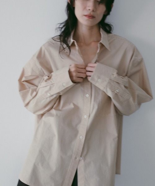 スタイリングのポイントになるストライプシャツ。オーバーなシルエットでラフに着ていただける一着。アイボリーはワントーン見えする3色の糸で織られたマルチストライプ。オレンジは2色のピンストライプに見えて、よく見ると細くもう1色ラインがあり、ほんのりと奥行きあるストライプになっています。ジャケットやコートの中にもさりげなく映えます。腰巻きしてコーディネートのアクセントとしてスタイリングしたり、同素材のStripe Layered Pantsとセットアップで着るのもおすすめです。