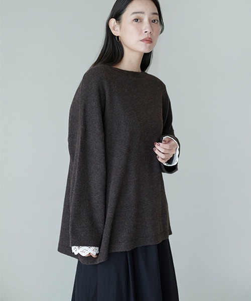 大人可愛いセットアイテムそれぞれ単品でも楽しめるニットチュニック×袖レースプルオーバーーーー【素材】ニットは柔らかい風合いの素材を使用しており、ご家庭でお手入れできるマシンウォッシャブルの機能付き。インナーは華やかなバテンレースを使用しています。【デザイン】ニットチュニックと袖レースを組み合わせたセットアイテム。ニットは程よくゆとりのあるシルエットで、気になる腰回りをカバーします。杢調カラーで高見えするのもポイント。カットソーの袖口には抜け感が素敵なバテンレースを施しており、コーデに華やかさをプラス◎セットではもちろん、別々でも楽しめるお得なセットアイテムです。ーーー【スタイリング】セットでご着用いただくことで、大人可愛いレイヤードスタイルが完成。パンツともスカートともバランスよく着こなせます。単品でも使えるので、ニットはシャツ合わせ、インナーは裏毛などカジュアルなアイテムとのレイヤードもおすすめです。