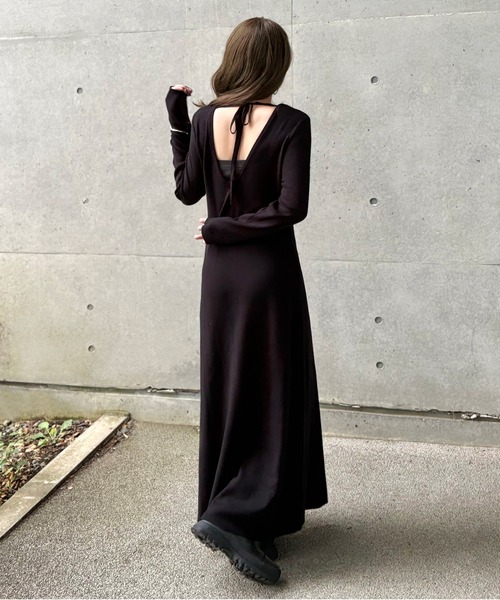 広めに開いたネックラインが女性らしいロング丈のニットワンピース。真正面はシンプルながら、後ろはオープンに仕上げたギャップのあるデザインです。センシュアルな面持ちに加え、揺らめくリボンも合わさって、より目を惹くバックスタイルに。厚すぎず薄すぎないニット地は、ソフトな肌当たりでほんのり温もりがプラスされた着心地の良い1枚に仕上がっています。フレアシルエットが足元を華やげる、パンプスともブーツとも好相性のアイテムです。■DETAIL・透け感:ややあり・生地の厚さ:普通・裏地:なし・伸縮性:ややあり<注意点>・色合いはモニター環境により若干の誤差が出ます。・サイズは平置きにして測定していますが、測り方によって誤差が出る場合がございます。・入荷・生産時期により、色、サイズ、素材など多少異なる場合がございます。・本製品は生産過程におきまして、生地を織る際の糸の継ぎ目や多少のほつれが生じることがあります。・簡易包装となっており、保管・梱包時にシワが伴う場合がございます。