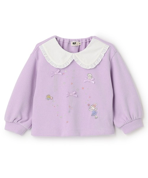 大きな衿が可愛らしいトレーナーです。後ろの衿ぐりはゴム仕様で、着脱もスムーズ。星空を飛ぶエンジェルmimiちゃんの刺しゅうがアクセントになっています。やわらかな素材感で、着心地も快適な1枚です。