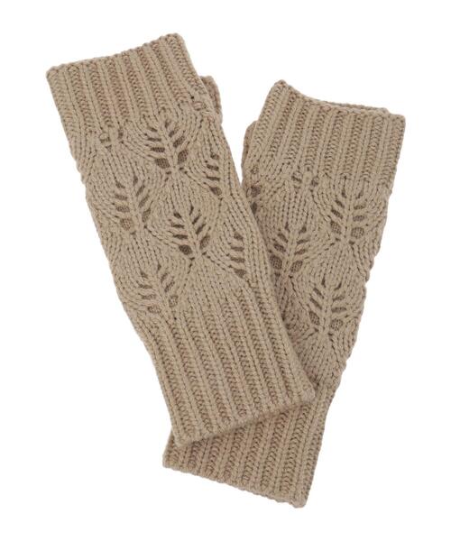 葉っぱ柄の透かし編みが表情感を演出するアームウォーマー。親指は分かれたデザインなので、ストレスフリーな着用感を実現します。フィット感のあるリブ切り替えがポイント。寒い季節のお出かけシーンに大活躍してくれるアイテムです。【その他採寸】F 全長:26cm