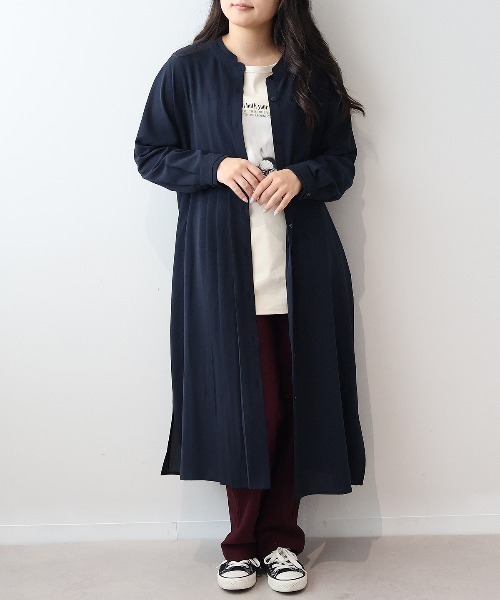 縦ラインで着痩せ効果。アシンメトリープリーツ ロングシャツワンピース 【デザイン】 右サイドにだけ施されたプリーツが、動くたびに美しい表情を見せるアシンメトリーデザインのシャツワンピース。 この縦のラインがシルエットをすっきりと見せ、自然なスタイルアップを叶えます。 体のラインを拾いすぎない、ややドロップショルダーと落ち感のある素材で、 肩周りや気になる部分を華奢に見せてくれるのも嬉しいポイント。 両脇のスリットがロング丈でも足さばきを良くし、 コーディネートに軽やかな抜け感をプラスします。 【素材】 柔らかく、しなやかな落ち感のある合成繊維を使用。 美しいドレープが生まれ、上品な印象を与えます。 程よい透け感があり、見た目にも涼やかで軽やかな着心地です。 ーーーーーーーーーーーーーーーーー 透け感:あり 伸縮性:なし 裏地:無し ーーーーーーーーーーーーーーーーー 【色展開】 着回しやすいベーシックな2色 ・カーキ(マスタードカーキ イエローオリーブ 黄緑色) ・コン(紺 ネイビー) 【スタイリング】 一枚でワンピースとして着るのはもちろん、フロントボタンを開けてTシャツやパンツの上に さっと羽織るだけで、こなれたレイヤードスタイルが完成します。 特に羽織りとして使うとIラインが強調され、着痩せ効果も抜群。 ワイドパンツやリブパンツとの相性も良く、リラックス感のある大人のカジュアルスタイルにおすすめです。 気になる腰回りやお腹周りをまるっとカバーしつつ、デザイン性も高い、主役級の一枚です。 【ブランド説明】 -MB mint breeze エムビーミントブリーズー 楽してキレイが叶う高感度、好感度カジュアルをテーマに L、LL、3L、4L、5Lを扱う大きいサイズ専門のブランド。 ゆったり着たい、ぽっちゃりさん、プラスサイズ、グラマーさんに多く支持されています。 《お気に入り登録》でお得な情報がいっぱい ・「商品のお気に入り登録」で再入荷通知や、人気アイテムのラスト1点通知、セール通知等お得な情報を受け取ることができます。 ・「ブランドのお気に入り登録」でSHOPの新作アイテムや再入荷など、お得な情報を受け取ることができます!