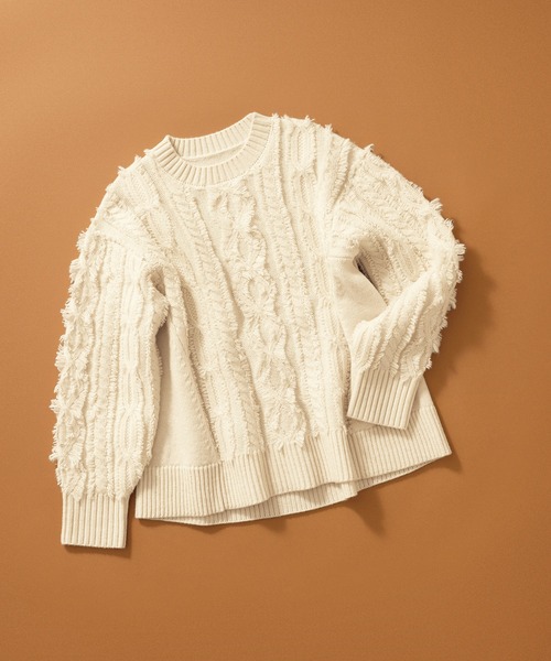 ICHIE*テンダーウールふっくらと柔らかく、軽やかな着心地が魅力のテンダーウール素材で編み立てたアラン柄ニットトップス。立体感のあるケーブル編みに、フリンジディテールを加えることで、表情豊かで存在感のある一枚に仕上げました。程よくゆとりを持たせたシルエットが、抜け感のある大人カジュアルな印象を演出しながらも、スカートにもパンツにもバランスよくマッチ。シンプルなボトムと合わせるだけで、季節感のあるスタイリングが完成する主役ニットです。洗濯:洗濯機使用可能(ネット使用)《お気に入り登録》はお得がいっぱい!「商品」のお気に入り登録で、再入荷、ラスト1点、セールなどお得な通知を受け取ることができます。「ブランド」のお気に入り登録で、新商品や再入荷などいち早くブランドの情報を受け取ることができます。是非、この機会にご登録くださいませ。