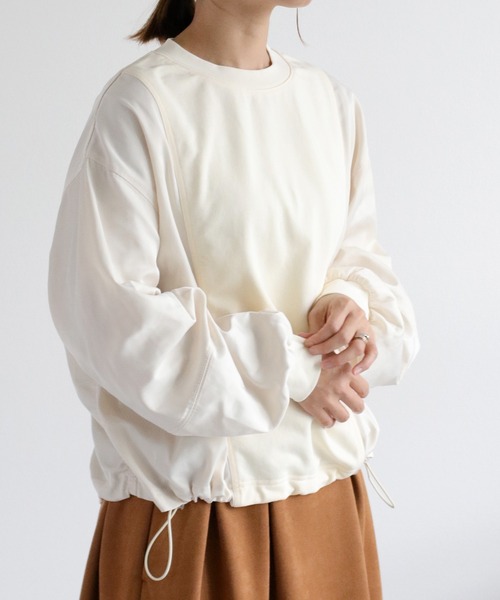女性らしいバルーンシルエットのプルオーバーにちょっとしたミリタリーテイストをプラス。生地切り替えとバックジップがアクセント♪◇Point◇バルーンシルエットのプルオーバーに身頃と袖で生地を切り替えミリタリーテイストに。袖部分は光沢のあるポリエステル生地を使用しており、1枚でモード+ミリタリーが表現できるアイテムです。バックにはスリットの役割も果たせるジッパーを付けています。インナーの柄をチラ見せできたり、ロング丈のシャツをレイヤードしやすくなっています。裾にはドローコードを施しており、絞ることで着丈を調整でき女性らしい丸みのあるシルエットに。サイドに生まれる細かなギャザーが立体的なシルエットを強調します。袖はMA-1ジャケットをイメージしたボリュームスリーブに仕立てています。同素材・カラーのパーカータイプも販売しています。・CCB-0628 ミリタリー裏毛ジップパーカー◇Material◇軽さのあるポリエステル生地を使用。切り替えの袖部分は光沢のある生地です。保形性があり、シワの回復も早いです。ややオーバーサイズなシルエットですが、着丈をショートにすることで野暮ったく見えないようにしています。※裏地なし。※ご家庭でのお洗濯が可能です。◇Coordinate◇ミリタリーテイストに上品さを併せ持つアイテム。ワイドスラックスやフレアスカートでのモードな雰囲気にもハマります。カジュアルにデニムとのスタイリングはもちろん、ワンピースやロングスカートとも好相性です。※照明や天候により実際の色味と異なって見える場合がございます。ご了承くださいませ。【キーワード】#Y2K#10代#20代#30代#40代#50代#ミリタリー#スウェットライク