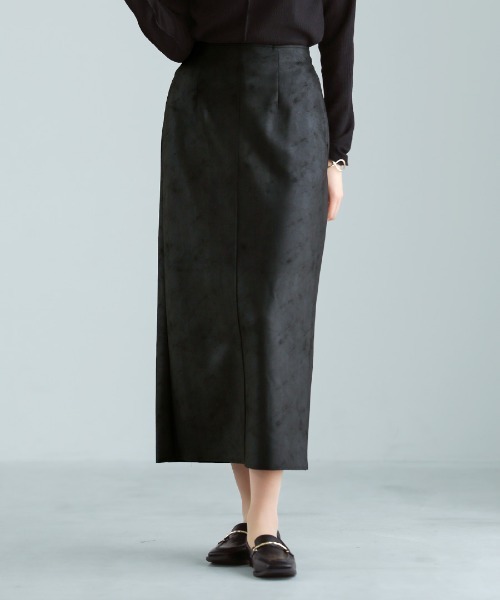 【 手洗いできる 】 ストレッチフェイクレザー・ナロースカート■ Emilyan ■「 しなやかに映える レディな一枚 」上品な艶感をまとったフェイクレザー素材で仕立てたナローシルエットのスカートです。リアルレザーのような見た目ながら軽くやわらかで、シワになりにくいのも嬉しいポイント。 ほどよくストレッチが効いているのですっきりとした細身ラインでも動きやすく快適なはき心地を叶えます。後ろにはベンツを入れることで足さばきも良くエレガントな表情をプラス。ウエストは後ろゴム仕様でリラクシーさを兼ね備え両脇には便利なポケット付き。さらに手洗い可能でデイリーに頼れる一枚です。オンオフ問わず、コーデをぐっと大人っぽく仕上げる秋冬に活躍するアイテムです。【 color 】●ブラウン●ブラック===================厚さ:★★★★☆ 透け感:なし裏地:なし伸縮性:ありケア:手洗い可シーズン:秋・冬===================【 fabric 】ポリエステル96% ポリウレタン4%【 model 】SAKURA 169cmMichelle 170cmMADE IN CHINA(企画・検品は日本)手洗い可 ウォッシャブル ストレッチ ロングスカート ナローシルエット レディース 通勤対応 オフィス デイリー