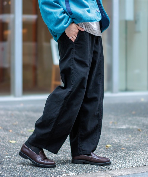 【 25Autumn & Winter 】 アーモンドの様な形を帯びたボリュームパンツ 人気のアーモンドパンツにあたたか素材が登場です! 丸みあるシルエットのアーモンドパンツ 柔らかい肌触りのセミスウェード生地 両面起毛仕様で暖かい穿き心地 <素材・デザイン> 柔らかくしっとりとした肌触りが魅力の上質なセミスエード両面起毛を贅沢に使用したアーモンドパンツ。肌に触れる内側も外側と同じくふんわりとした質感で、優しい温もりを感じられます。 見た目にも上品なスエード調で、秋冬のコーディネイトを引き立ててくれます。 アーモンド形の様に太もも周りにふくらみを持たせ、丸みのあるリラックス感のあるシルエット。フロントの切り替えデザインにより、全体的なボリューム感を持たせながらも裾に向かって狭くなり、メリハリをつけてスッキリとした印象に仕上げました。ボリュームがありながらも、ワイドパンツのように広がらず、ほんのりと丸みのあるきれいなシルエットを作ります。 後ウエストはゴム仕様で、サイズ調節を可能にし、ストレスフリーな着心地を実現。尾錠デザインもこだわりのひとつです。 カジュアルテイストには勿論ですが、シャツなどに合わせてシックなテイストの崩しアイテムとしても着用できます。 …………………… 透け感:なし 厚さ:やや厚手ウエスト : 後ゴムあり 伸縮性:なし 裏地:なし 洗濯:可 …………………… コットン100% ◇着用レビュー H160 / 着用サイズ M 踝くらいの着丈で、程よくゆったりとした穿き心地です。 人気のアーモンド形は、脚ラインを気にせずに着用でき、トレンド感もあるパンツです。 ごわつきのない肌触りの起毛感で、秋から着回しのしやすいカラーが嬉しい◎ H163 / 着用サイズ S 163cmで丁度踝が隠れるほどの着丈で、触り心地のいい生地感なので着心地がいいです^^ 後ウエストがゴム仕様なので、ストレスなく着用できます。 [D.M.G / ディーエムジー] 厳しい品質管理のもと、児島・さぬき市の国産工場で縫製しています。児島の洗い工場で加工を施した製品は肌馴染みの良い生地感に仕上がり、履き込むほどに独特の風合いを生み、長く味わっていただける商品となります。「デニム」・「ワーク」・「ミリタリー」といったカジュアル服の普遍的なキーワードをイメージソースに、ベーシックでありながら程良く時代と寄り添ったデイリーウェアーを提案します。 お問い合わせ品番:14-0354X/ 14-354X
