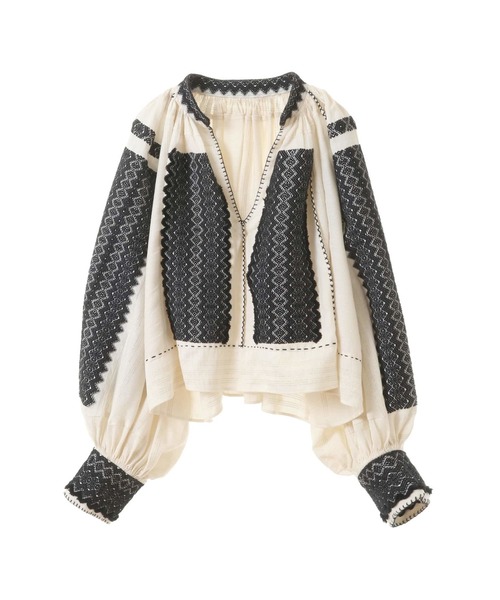 ルーマニアで見つけた30‘sのハンドジャガードのブラウスからのインスピレーションで作られた素材。桐生産地で織られたジャガードは刺繍よりも凹凸感がありソフト。更にハンドステッチやクロス刺繍、ハンドギャザーを施し受け継がれるVintageになるべく美しい仕上がりになっています。 【CURRENTAGE/カレンテージ】 CURRENT+VINTAGEの造語、CURRENT+AGEの造語。 “クラシックな洋服の成り立ちに少しの新しさを加えてモダンな佇まいに仕上げる”をコンセプトに、 世代や時代を超えて今を生きる女性の為のワードローブを提案している。 素材や縫製、シルエットまで細部にこだわり、何年後かに引っ張り出して着たくなるような、ヴィンテージ感を楽しめるアイテムが揃う。