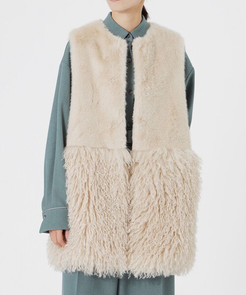 コーディネートのアクセントになるフェイクファージレ【素材】柔らかなタッチが魅力のフェイクファーを使用。種類の違うファーを組み合せてた異素材ブロッキングの商品です。【シルエット/デザイン】ブロッキングしたファー使いがデザインポイント。サイジングをパターンで調整することで、モコモコしながらも、着ぶくれしにくいサイジングで仕上げました。ヒップまでカバーしてくれる程よい着丈もうれしいポイント。また、様々なトップスとレイヤードできるようアームホールは広めに設定。両脇にはシームポケットも備わった、機能性とデザイン性を兼ね備えた一着です。【スタイリング/その他】同色のニットにウォーム感のあるワイドパンツを合わせて、素材の変化とIラインが引き立つ洗練ワントーンコーデに。ジレのインにはシアーブラウスを重ね、サテンフレアスカートと合わせれば、質感のコントラストが映えるモードな着こなしに。━━━━━━━━━━━━━━━━━━━━━━━━━━お買い物をお楽しみ頂くために<商品のお気に入り登録>完売カラーの再入荷通知など、お得な情報をお届けします。<注意事項>この商品はサンプルでの撮影を行っています。実際の商品とイメージが異なる場合がございます。撮影環境により、光の当たり具合で色味が違って見える場合があります。あらかじめご了承下さい。