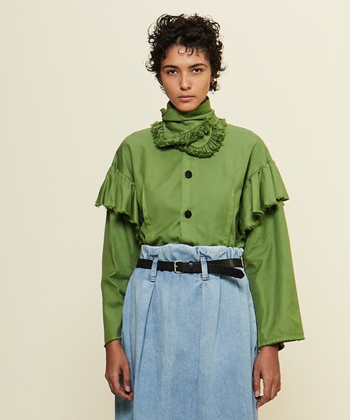 フィンクス糸を3本撚りにした贅沢なオックス。通常は2本撚りのところ3本撚りにすることでオックス目が立ちフィンクス糸の光沢感が際立ちます。あえて綺麗に仕上げず、製品染めすることで更に目を詰めて風合いを出しています。色は敢えて王道でなく少し外した色で表現。素材のバルキー感を活かしたウエストシェイプされたシルエットの美しいデザイン。ノーカラーで大きめのボタンが施されているので羽織りとしても使えるデザイン。アームホールの大きなラッフル、取り外し可能なフリル襟は巻き方でハイネック風のフリル襟としてももカマーベルトとしても使うことができます。気分で色々な着方をしてもらえる1枚。 【CURRENTAGE/カレンテージ】 CURRENT+VINTAGEの造語、CURRENT+AGEの造語。 “クラシックな洋服の成り立ちに少しの新しさを加えてモダンな佇まいに仕上げる”をコンセプトに、 世代や時代を超えて今を生きる女性の為のワードローブを提案している。 素材や縫製、シルエットまで細部にこだわり、何年後かに引っ張り出して着たくなるような、ヴィンテージ感を楽しめるアイテムが揃う。