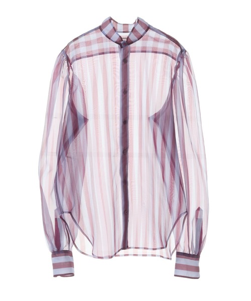 透け感のあるオーガンジー素材に太めのストライプをプリントした素材。 変形立ち襟のブラウスは肩にギャザーが入り少しショルダーの立ち上がるロマンティックだけど強さのあるムードに仕上がっています。 【CURRENTAGE/カレンテージ】 CURRENT+VINTAGEの造語、CURRENT+AGEの造語。 “クラシックな洋服の成り立ちに少しの新しさを加えてモダンな佇まいに仕上げる”をコンセプトに、 世代や時代を超えて今を生きる女性の為のワードローブを提案している。 素材や縫製、シルエットまで細部にこだわり、何年後かに引っ張り出して着たくなるような、ヴィンテージ感を楽しめるアイテムが揃う。