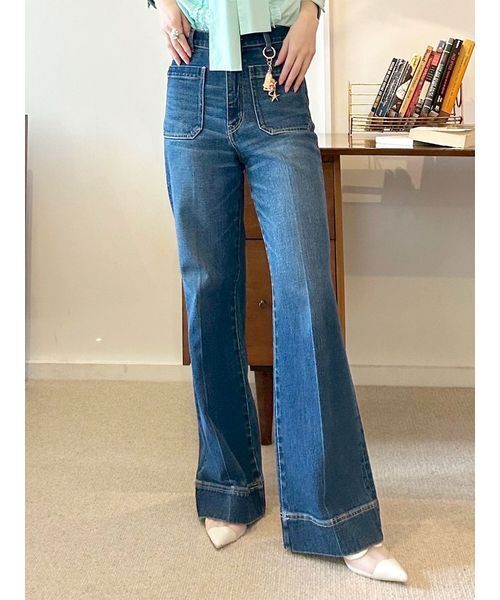 【美脚効果を高めるボーホーデザインフレアデニム】 【Design/Styling】 トレンド感のあるボーホーデザインを取り入れたストレートフレアデニム。ハイウエストで腰まわりをタイトに仕上げ、縦にすっきりと落ちるセンタープレスが美脚効果をさらに引き立てます。フレアシルエットが脚長見えを叶え、合わせるアイテムを選ばない万能な一本。カジュアルにもきれいめにも、幅広いスタイリングで活躍します。 【Fabric】 ストレッチ性に優れたデニム生地を使用し、動きやすさと快適な履き心地を両立。デイリーに取り入れやすく、長時間の着用でもストレスフリーで楽しめる実用性の高いアイテムです。 透け感;なし 裏地;なし 伸縮性;あり 光沢感;なし 生地の厚さ;普通 【00サイズについて】 00サイズはファッションを楽しむ小柄な女性のためにお作りしたサイズです。 身長が小さめの小柄な女性にもフィットするよう、通常のFサイズや0サイズから着丈・袖丈などをリサイズし、バランス良くお召し頂けるようにお作りしております。 ※照明の関係により、実際よりも色味が違って見える場合があります。 またパソコン・スマートフォンなどの環境により、若干製品と画像のカラーが異なる場合もございます。予めご了承ください。 商品の色味は、商品単品画像をご参照下さい。 ※商品画像はサンプルのため、色味やサイズ等の仕様に変更がある場合がございますので、予めご了承ください。