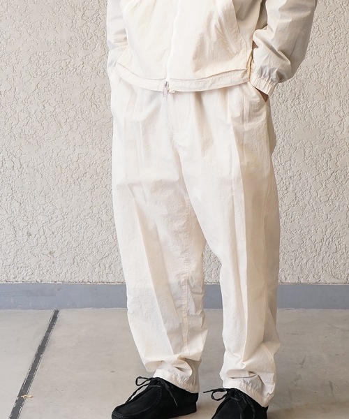 TROVE 25AW "Future vintage”日本人が持つ、緻密で高品質なモノづくりの考え方を現代に当てはめ、"Future vintage"となる服、"貴重な収集品=TROVE"となることを目的に作られた服。生地は、原料や混率に捉われず、その素材の特性が活かされたものを採用。混紡素材や合繊素材も現代の進化ととらえ、アイテムとの調和を考えて使用。縫製糸に関して、安価な”スパン糸"ではなく、耐久性に優れたポリエステル糸の芯に綿糸を巻き付けた”コア糸”を使用。日本的モノづくりの発想から生まれた”コア糸"を使用することで、強度性を保ちつつ、綿糸の持つ色彩と経年変化を感じられる服を提案します。"パンツの道具としての機能性、パンツを楽しむという側面を併せ持ったアイテム"機能的で使いやすいナイロン製品、通年着用できるものを作りたいという発想から完成したアイテム。ナイロン生地については風合いを出すことに注力、細強撚りのハイカウント糸で織り上げた生地を採用。適度なハリコシ、滑らかな肌触り、上品な光沢感を備えた。製品加工し、生地の”アタリ”や"縮み”などの経年変化したような風合いを表現。メッシュ素材を裏地に配し、ナイロンパンツ特有のムレを軽減。着用者の幅を広げるイージー設計、適度なルーズシルエット。フロント前閉じファスナー、ウエスト内側にコードを配備。裾のドローコード、ウエストのオリジナル"Tカン"、ウエストループなども備えた多機能設計。※同素材の"74BLS01"とセットアップで着用可能ブランド品番:74PAN02
