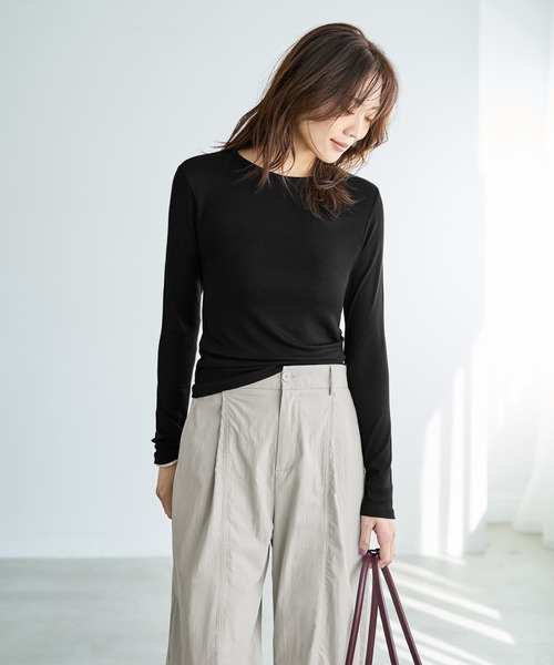 【待ってました!なクルーネックタイプ】 あの『とろみ薄リブ』に新型が登場です! ◆デビュー以来お客様からの厚いご支持をいただく『とろみ薄リブ』トップスに、待望のクルーネックタイプが登場。冬の重ね着に一度使用したらやめられない、肌触りの良さとスッキリ感、合わせやすさに優れたシリーズです。 ◆生地は薄手で柔らかく、ものすごくよく伸びるのが特徴。薄手ながらも透ける感じはなく、フィットはしますがピチピチにはならない、という絶妙加減が人気のヒミツ。そしてなんといっても身体を細く華奢に見せてくれるのが嬉しいポイントです。 ◆一枚で着るというよりは、防寒インナー代わりに何かの下に着ることをメイン目的としたシリーズ。そして首元や袖口、裾などをチラ見せして重ね着を楽しむためのトップスです。 ◆防寒インナーの場合は下着感がありますがこちらには無く、一枚になってもおかしくないところも利点。ジャケットのインナーにした際、ジャケットを脱いで過ごすこともできますし、ジャンパースカートのインナーにした際、見える面積が多くてもまったく問題ありません。 クルーネックトップスの首元からカットソーのネックラインを少し出す重ね着スタイルを行う際は首開き加減が双方でマッチしないとキレイにきまらず、なかなか難しいことがあります。 しかしこの生地の場合はとにかく柔軟に伸びるため、ある程度は好きな形に整えられるというのが凄いところ。首開きが足りなければ下げて広げたり、首を詰まらせたければネックラインを上にズラしたりと、フレキシブルに動かすことができます。そういう柔軟なカットソーはなかなか無いので、かなり珍しいと思います。 ◆サイズ感:基本的にはMサイズですがSサイズ体型の方でも対応ができ、Lサイズ体型の方でも問題がない伸び感を誇ります。ただ伸びるだけではなく、計算された極細リブにより凹凸を作り、肉感を響かせにくくする効果も備えています。 ◆温度感:ユニクロさんのヒートテックよりも少し暖かいかな?という程度です。 ◆厚み:ヒートテックよりは厚いですが、カットソー生地の中では薄い方です。重ね着をしてもモコモコせずにスッキリときまる、使いやすい厚みです。 ◆静電気:とくに静電気がおきやすい生地ではありません。 ◆耐久性:着用頻度と洗い方、摩擦具合にも左右されますが、適切に扱っていれば毛羽立ちなどは気になりません。薄手カットソーの中では耐久性が高いタイプです。 【その他の仕様】 ◆着用時期:10-3月が目安 ◆丈感:前は下腹が隠れる丈感/背面は腰が隠れる長さ ◆シルエット:ストレート ◆首元:クルーネック ◆肩幅:問わないタイプ ◆アームホール:普通 ◆袖幅:普通 ◆袖丈:長袖(指にかかる長さ) ◆厚み:薄手 ◆柔らかさ:柔らかい ◆肌触り:フニャフニャ・しっとりした感じ ◆着用ジワ:できにくい ◆毛羽立ち:できにくい ◆伸縮性:あり ◆光沢感:なし ◆透け感:なし(ホワイトは多少あり) ◆スリット:なし ◆ボタンやファスナー:なし ◆手洗い:可能 ◆アイロン:不要 ◆スチーマー:使用OK 【お色について】 ◆ブラック:通常の定番的なブラックです。 ◆チャコール:チャコールグレーにほんのりとブルー味を乗せた、ニュアンスのある発色。合わせやすくて暗く見えずに、オシャレに見えて色香のある、こだわりの特別なチャコールグレー。素晴らしい着回し力を誇ります ◆ホワイト:漂白したような真っ白とは異なる、肌馴染みの良い白。クリーム色感などは無い普通のホワイトです。 ◆ライトブラウン:差し色としてポイントになる存在感と目立ち過ぎない落ち着き感、合わせやすさを熟考したお薦めのカラー。オレンジ色をダークにしたような、かなり明るさのあるオレンジ系ブラウンです。