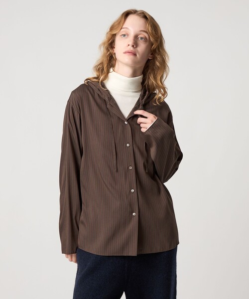 落ち感のある素材を使用した、フード付きストライプシャツ。共地のコードを襟口に入れた、前開きのデザインです。やや身幅を持たせたゆとりのあるシルエットながら、繊細な素材感がエレガントさをプラス。一枚着はもちろん、カットソーの上にレイヤードしたり、ニットのインに合わせるのもおすすめ。さまざまな着こなしが楽しめる一着です。同シリーズでレギュラーカラーのシャツがございます。「対象品番:82112000004」【注意事項】※商品に「取り扱い上の注意書き」、「洗濯表示」がございます場合は、使用前に必ずご確認ください。※商品画像は、光の当たり具合やパソコンなどの閲覧環境により、実際の色味と異なって見える場合がございます。あらかじめご了承ください。※商品の色味の目安は、商品単体の画像をご参照ください。店舗へお問い合わせの際は、全国のSteven Alan各店舗まで下記の品名/品番をお申し付けください。品名:SA TE/RA/SE/PL STRP FD 品番:82112000005