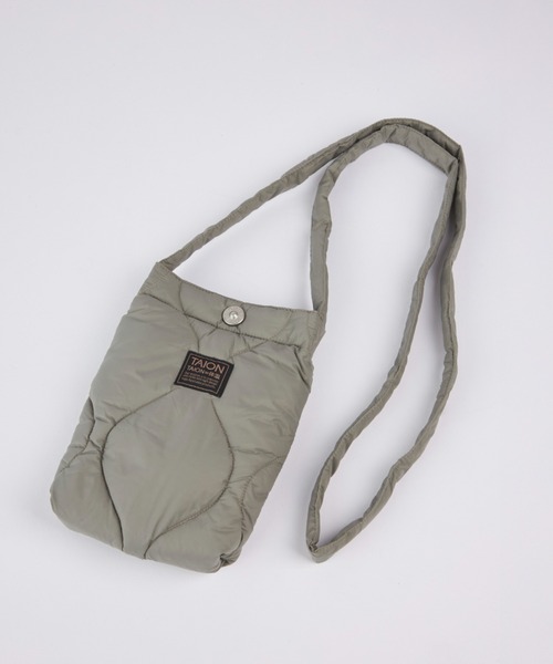 ■デザイン "ワードローブのアクセント、ミニショルダーダウンポーチ" ワードローブのアクセント、ミニ(スマホや財布等が収まるサイズ)ショルダーダウンポーチです。高密度ナイロン生地に、800FPの上質ダウンを使用しヘチマキルトで仕上げ軽くて柔らかな質感を再現しました。バッグ口は、サッと荷物を取り出せる金属ボタン開閉仕様。着こなしのアクセントに使えるバッグです。 ・柔らかく張りのある高密度生地を使用しています。 ・800FPの上質なダウンを使用しています。 ・バッグ口にはYKK金属スナップボタン(TAION刻印)を使用しています。 ・ご家庭での洗濯も可能です。 ※男女兼用です。 ■MILITARY LINEについて MILITARY LINEはその名の通りミリタリーをモチーフにしたインナーダウンを取り揃えたラインです。 ■TAIONのダウン品質について TAIONは、嵩高の高い800FPのダウン(羽毛)を採用しています。 一般で使用されるダウン(一般:600FP前後)よりも軽くて、 暖かい空気をたくさん含むことができます。*一部800FPではないアイテムもあります。予めご了承ください。 ■ATTENTION ダウンは天然由来の素材であるため、稀に濃い色の羽が混入することがあり、表面に透けて見える場合がございます。※こちらは不良品ではございません。返品や交換につきましてはご対応いたしかねますので、あらかじめご了承ください。(解消方法:少し目立つ箇所がございましたら両手で少し揉んで頂くと目立たなくなります。)