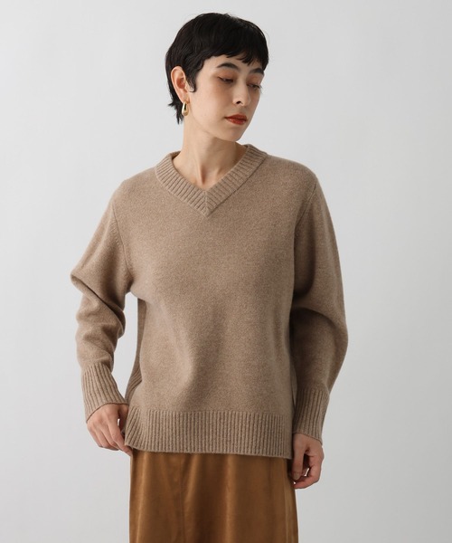 カシミヤ混で着心地のよさが魅力シンプルなデザインながら素材にこだわったVネックプルオーバーーーー【素材】ウール94%、カシミヤ6%の紡毛糸を使用。厳選されたオーストラリア産スーパーファインウールとモンゴル産カシミヤをブレンドした素材です。柔らかさとスポンディッシュな風合いが特徴的です。【デザイン】着心地のよさが魅力のAQUAニット。通常の紡毛糸には使用しないような非常に繊度の高く、繊維長が長い原料を使用することでソフトでしっとりとした風合いでスポンディッシュな仕上がりになっています。また、ウール素材は高羊毛で、上品な光沢と発色の良さがあります。浅いVネックが首元を優しく包み込み、ダブル組織で内側を配色にデザインされたリブ編みの襟が特徴です。ーーー【スタイリング】きれいめなスカートからカジュアルにワイドボトムやデニムまで幅広く合わせやすいアイテムです。