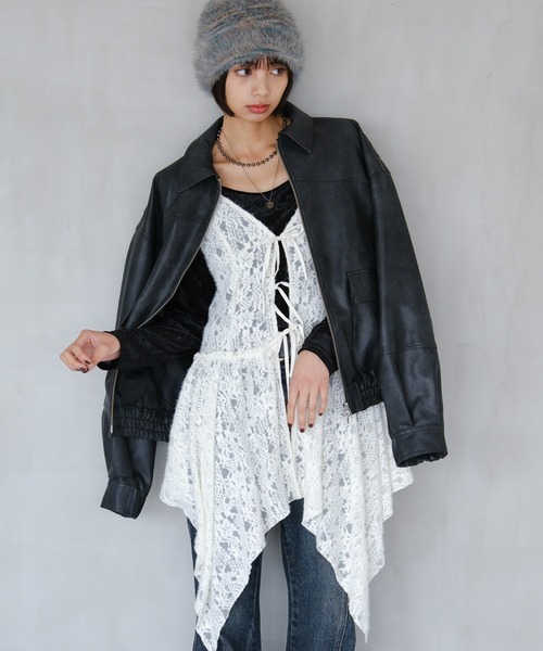 \フェミニンとモードを両立させるレースキャミチュニック/ 温かみのある起毛レースを使用した、秋にぴったりなエッジの効いたキャミチュニック。 繊細で柔らかい表情の起毛レースは、透け感と起毛が生む陰影で動きとともにニュアンスを変えるのが特徴です。 フロントに並ぶ三段リボンは、フェミニンな雰囲気を残しつつもセンシュアルさと構築的なデザインを両立。 裾に向かって広がるフレアシルエットと、イレギュラーヘムのカッティングが動くたびにモードなニュアンスを生み出します。 後身頃はゴム仕様になっているので、厚手のインナーとのレイヤードも◎ シーズンレスで着用しやすく、スタイリングにも取り入れやすい一枚です。 インナーに抜け感のあるラウンドネックニットやスウェットをレイヤードして、異素材のコントラストを楽しむのがおすすめです。 レザージャケットやミリタリーブルゾンで外せば、ストリートモードな印象に。 足元はブーツで引き締めることで、甘さの中にもエッジを効かせたスタイルが完成します。 〈注意事項〉 ※こちらのアイテムは、値札に表示されている価格と販売価格に1円の差があります。 システム上発生してしまう差異となるため、予めご了承ください。※ ・サンプルにて撮影をしておりますので、実際の商品とは素材や仕様・加工・サイズ等が若干異なる場合がございます。 ・モニター・環境等により実際の商品と色味が多少異なって表示される場合がございます。予めご了承をお願いいたします。 ・撮影環境により、光の当たり具合で色味が違って見える場合があります。あらかじめご了承下さい。 ▼気になるアイテムは《お気に入り登録》がおすすめです! 完売カラーの再入荷情報、セール情報、ラスト1点の通知を受け取ることができます! ▼《ブランドのお気に入り登録》で新商品や再入荷などのお得な情報をいち早くお知らせします。